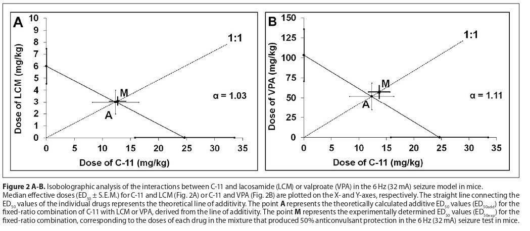 assessing protection against psychomotor seizures. Dose–response relationships were established using log–probit analysis, and median effective doses (ED50 ± SEM) were calculated. Type I isobolographic analysis was applied to determine the interactions between C-11 and LCM or VPA administered in a fixed-ratio combination (1:1).